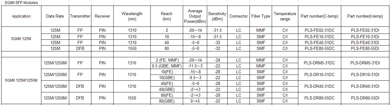 Ø 10km/40km/80km SMF transmission at 125M and 1.25G